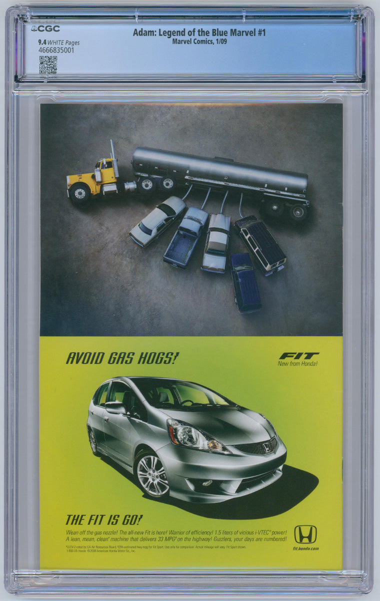 Adam: Legend of the Blue Marvel #1 featuring his first appearance. The comic was graded by CGC at 9.4